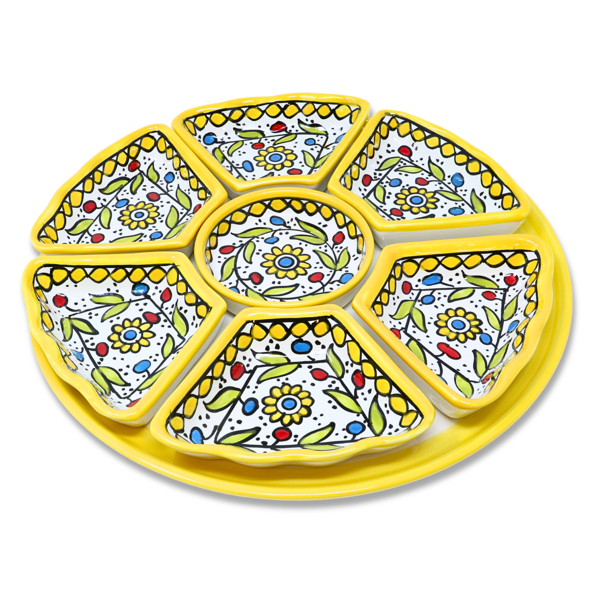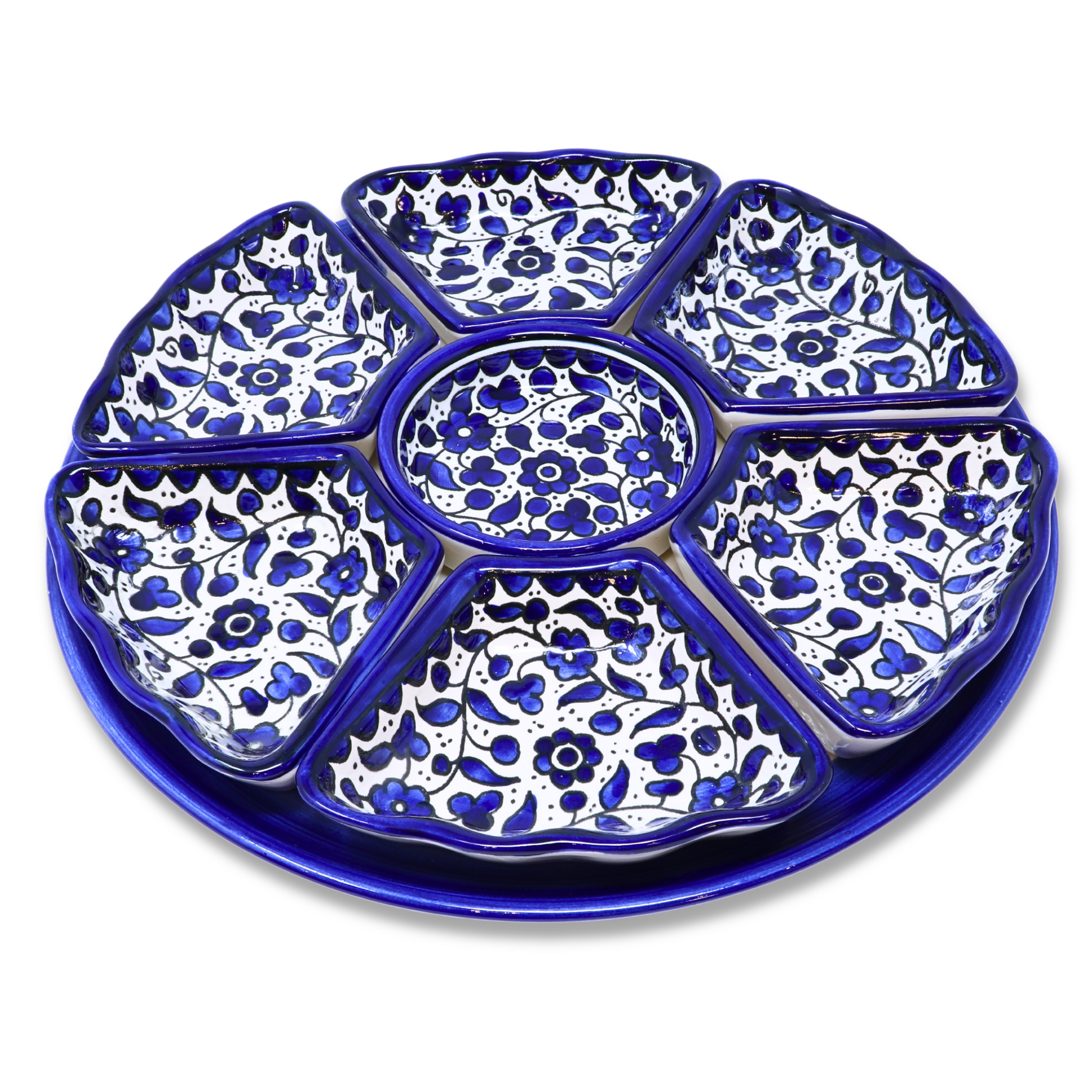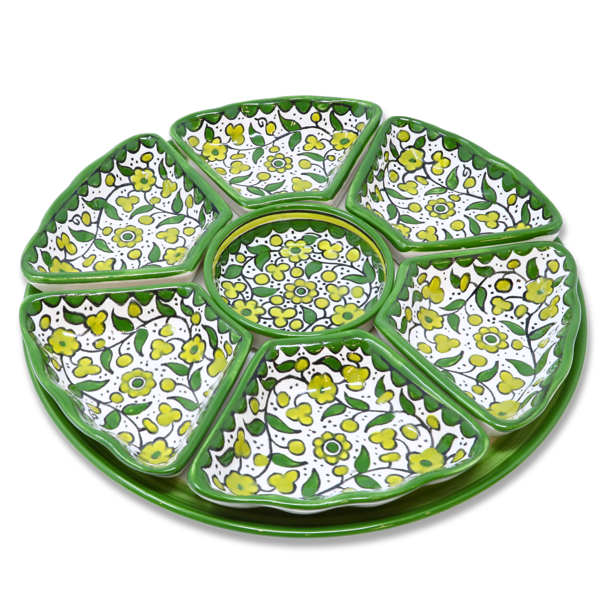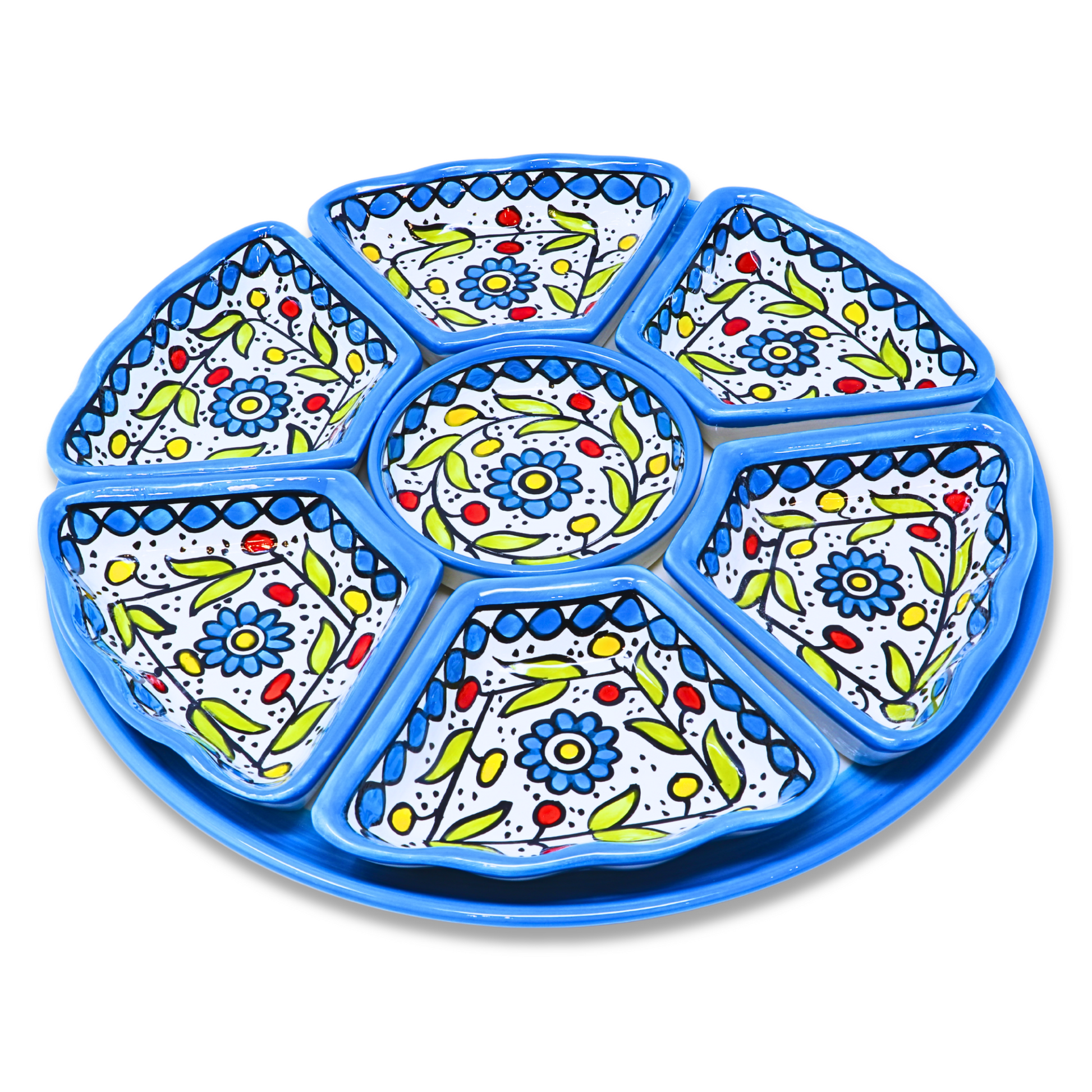 Elevate your entertaining with the Handmade Ceramic 8-Piece Appetizer and Condiment Platter, a masterpiece of Palestinian Artistry. Lovingly crafted in Hebron, Palestine, this platter, with a diameter of approximately 32 cm (12.6 inches) and a weight of 4.7 lb (2.1 kg), is a symphony of color, function, and cultural significance.