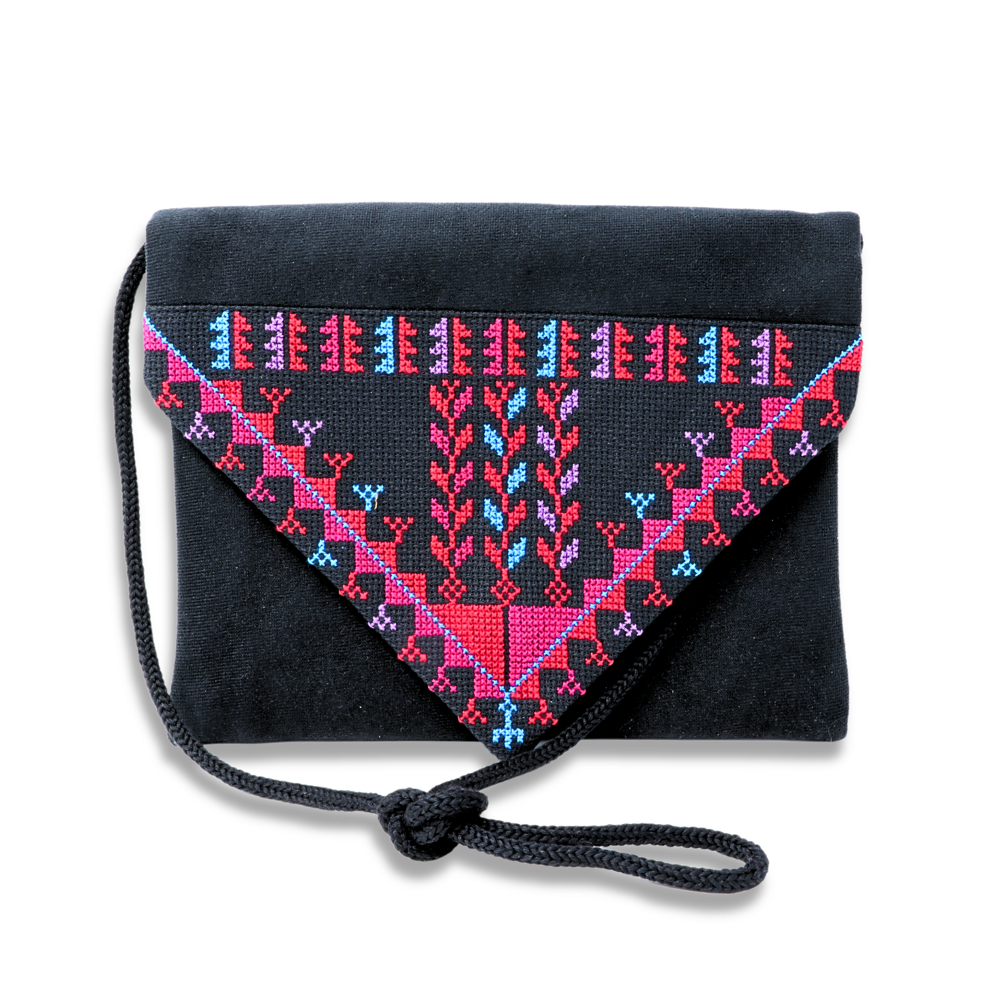 Introducing the Charming Crossbody Bag, a casual masterpiece in thread that seamlessly blends tradition, fashion, and culture. Meticulously crafted in Gaza, Palestine, this exquisite bag features a triangular embroidery design, adding a burst of color and cultural richness to your everyday ensemble. Created by skilled artisans, women, and girls, with finishing touches completed in small workshops, this hand-embroidered crossbody bag is a luxurious expression of Palestinian artistry.