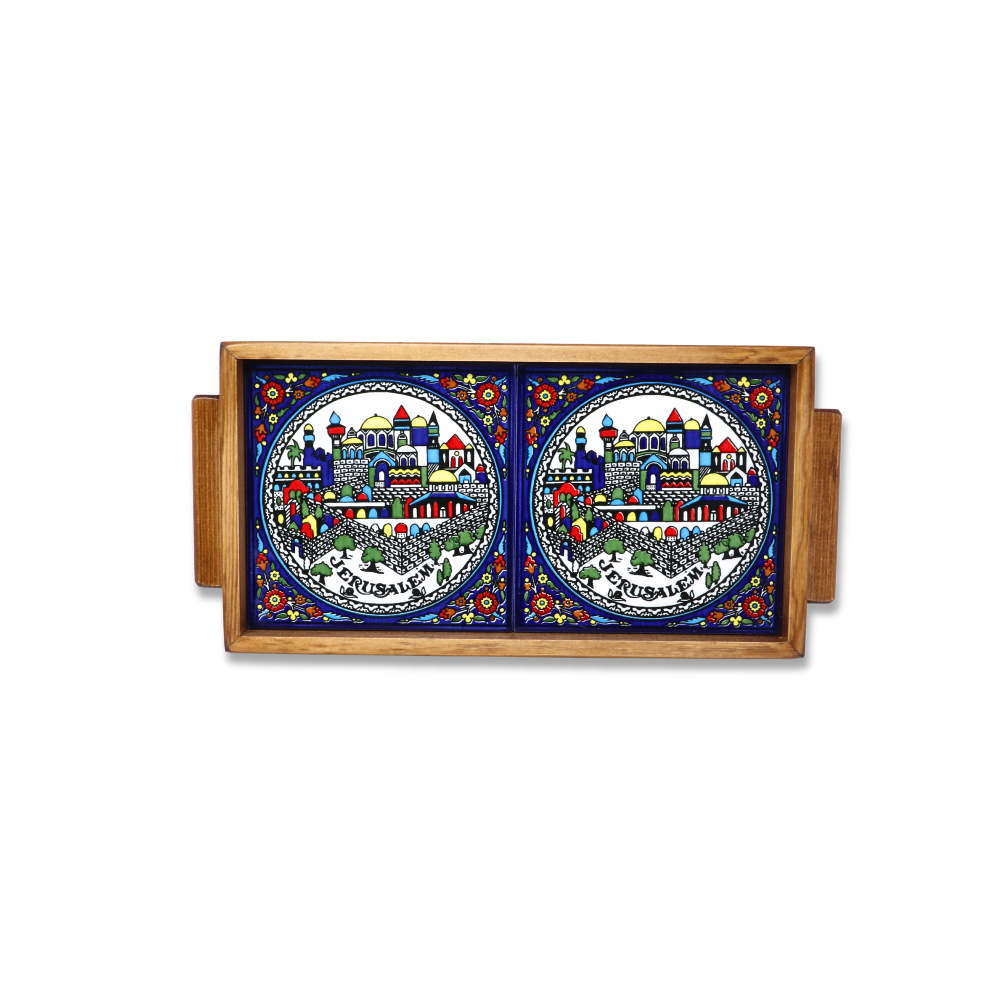 Elevate your dining experience and add a touch of Palestinian heritage to your space with this Handmade Wooden Tray with Ceramic Tiles.