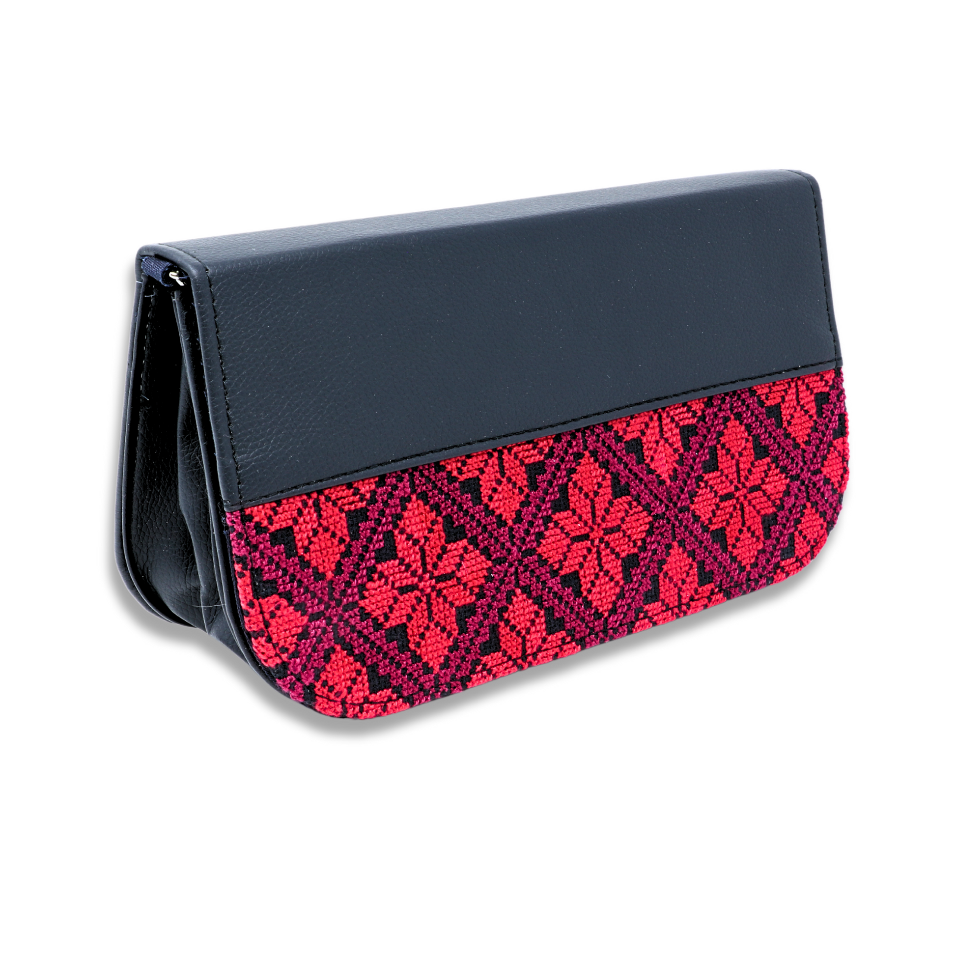 Elevate your fashion with the Stylish Soiree Leather Bag, a harmonious blend of DMC Cross Stitching artistry and contemporary design. Meticulously crafted in Gaza, Palestine, this exquisite bag boasts a rectangular shape with curved edges, infusing a burst of color and cultural richness into your ensemble. Crafted by skilled artisans, women, and girls, with the finishing touches completed in small workshops, this leather bag is a luxurious embodiment of hand-embroidered elegance.